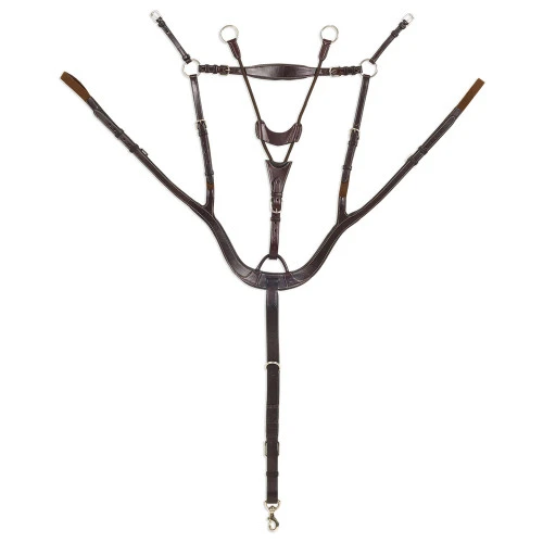 Pessoa PRO 5-Point Breastplate is a luxuriously handsome anatomic breastplate that keeps your saddle in place while allowing comfort for your horse. The anatomic design delivers freedom of movement for the shoulders while the supple leather with padding is kind to the coat and skin. The PRO 5-Point Breastplate from Pessoa Bridleworks can be adjusted at multiple points. There are adjustment buckles that fasten on the rings, welts and girth. Discreet elastic inserts allow comfortable stretch and a flat, streamlined fit. The girth strap has a swivel buckle for attaching to your girth’s dee ring.