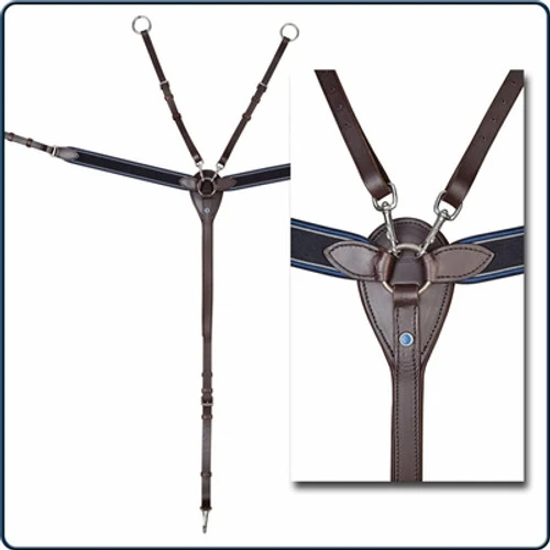 The Stubben Wide Elastic Breastplate with Running Attachment features a padded leather center, wide 1 3/8″ elastic straps (with that great Stubben blue stripe), easy clip-on/off running attachment, snap hook at the girth, and clips for easy on-off your d-rings. As with all Stubben tack, this breastplate looks great and works even better. Cob or Full size. Colors: Black or Ebony;Tobac may be available as a Special Order.