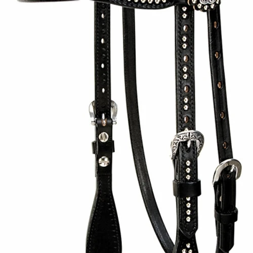 Stunning Black Browband Headstall with silver spots at Marystack.com! Back in Black Browband Headstall by Weaver is the new look in horse headstalls. Made with premium black English leather bridle leather this black headstall is accented with floral conchos and nickel plated brass spots. Leather measures 5/8″. Brow band tapers from wide to just 1/2″ across the front which gives a sleek, refined look to your horse! Cheeks have tear drop shape. Handsome Back in Black Headstall from Weaver will look great on just about any horse!